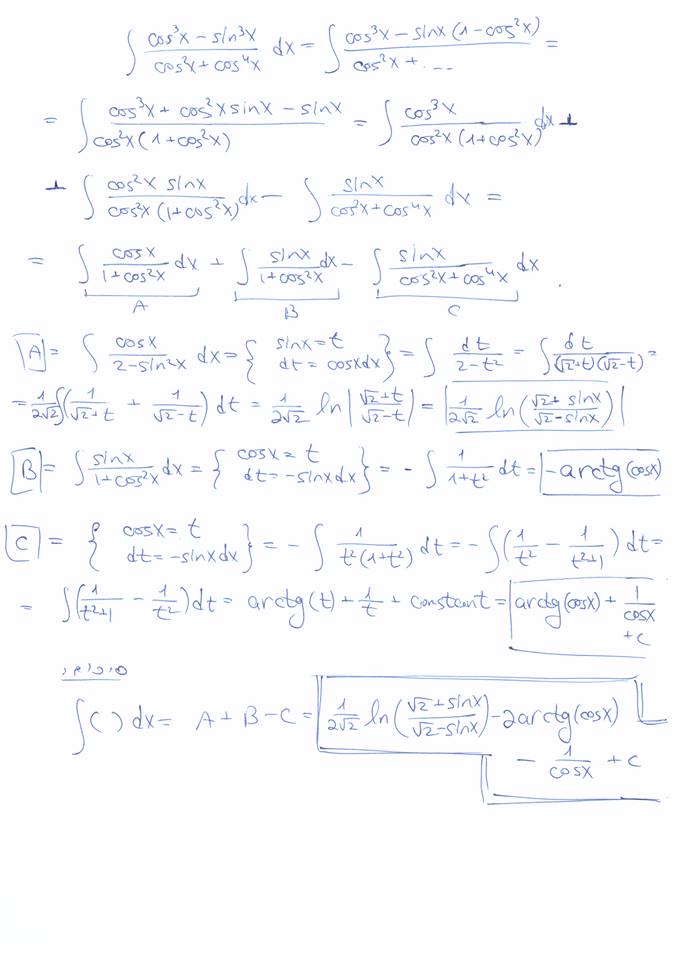 [math]\displaystyle{ x+\frac{2}{3}\ln|x-1|-\frac{1}{3}\ln|x^2+x+1|-\frac{2}{\sqrt{3}}\arctan\frac{2x+1}{\sqrt{3}}+c }[/math]