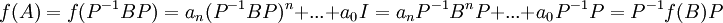- [math]\displaystyle{ f(A)=f(P^{-1}BP)=a_n(P^{-1}BP)^n+...+a_0I = a_nP^{-1}B^nP+...+a_0P^{-1}P = P^{-1}f(B)P }[/math]