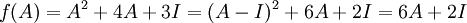 [math]\displaystyle{ f(A)=A^2+4A+3I = (A-I)^2+6A+2I = 6A+2I }[/math]