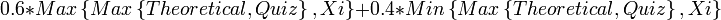 חישוב הציון הסופי בוצע בעזרת הנוסחא [math]\displaystyle{ 0.6*Max\left\{Max\left\{Theoretical,Quiz\right\},Xi\right\}+0.4*Min\left\{Max\left\{Theoretical,Quiz\right\},Xi\right\} }[/math]